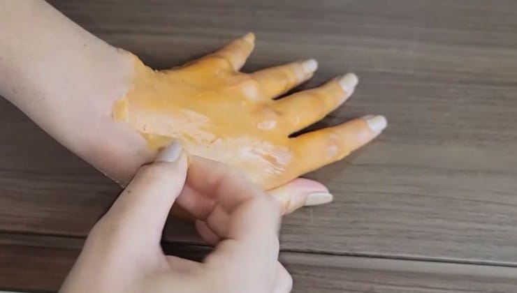 - Étalez le masque tiède en couche uniforme sur le dos de vos mains à l’aide d’un pinceau cosmétique.