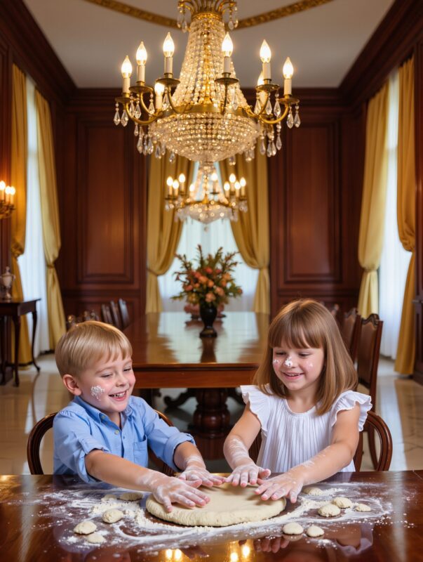 La pièce, généralement impeccable, était recouverte d’une fine couche blanche : de la farine. Léo et Camille, le visage maculé de pâte, riaient de bon cœur tandis que Clara leur enseignait l’art du pétrissage. Elle avait retroussé ses manches, le visage illuminé, et lançait de petites boules de pâte sous les cris ravis des enfants.