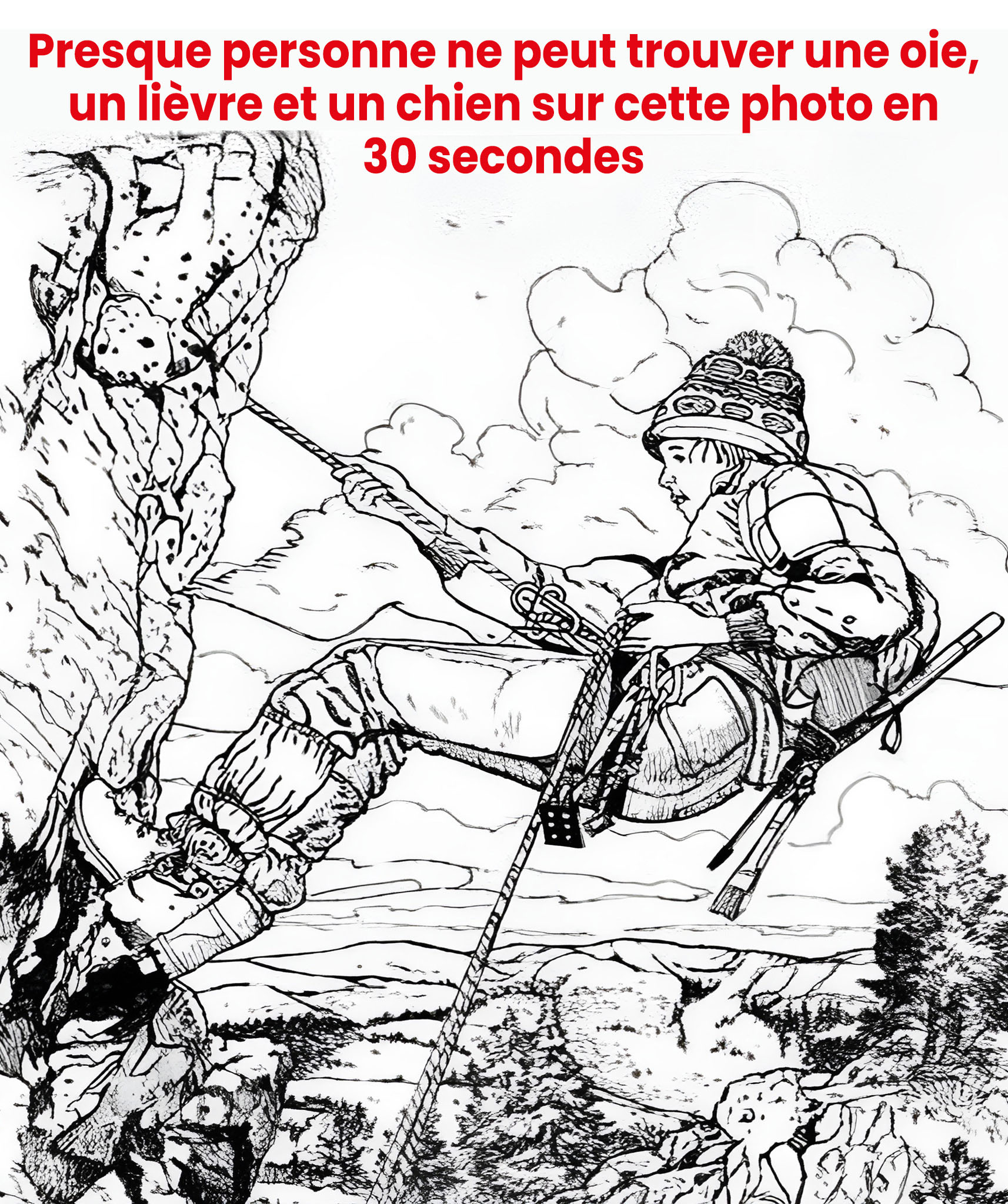 Qui irait examiner les nuées pour y traquer un animal ? Et pourtant, le dernier intrus se terre justement là où le regard ne se porte pas d’emblée. Dans ce panorama, la silhouette d’une oie se confond avec les masses cotonneuses du ciel et les traits pâles d’un roc près de la cime.