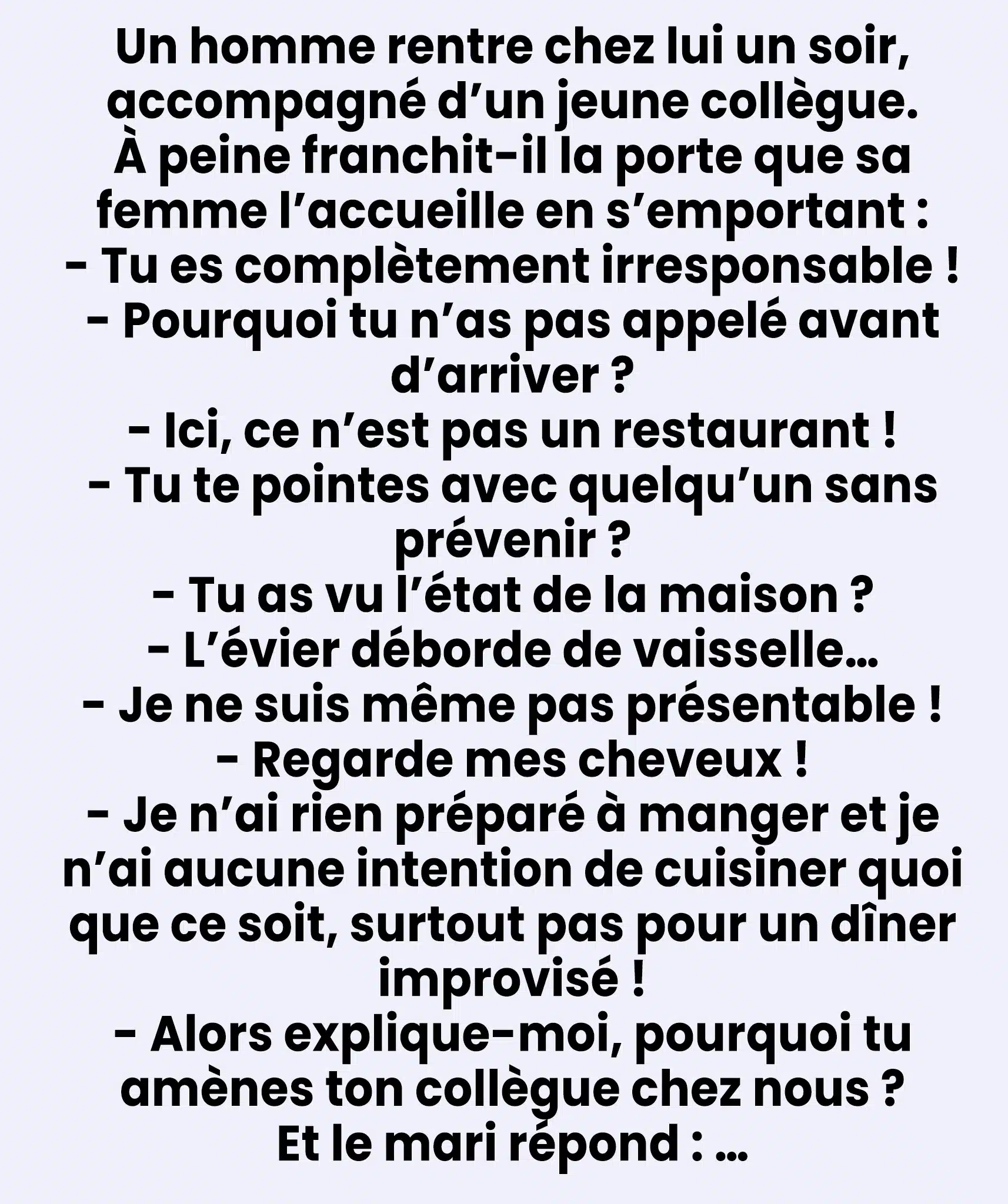 Lui : « La même chose que toi… je me précipiterais chez ta sœur aussi ! »